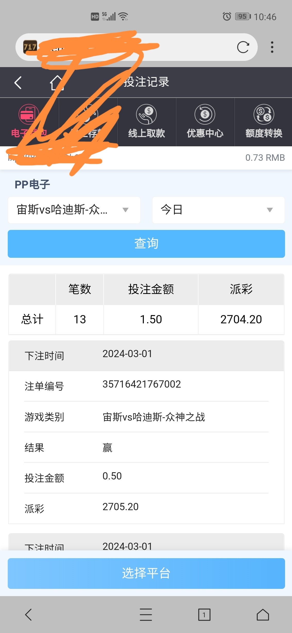 看交流区都是哈迪斯爆奖,今天月初26的返水压了一把闲,变成52,进去哈迪斯试试水,0.5一把,总计投注1.5元,居然大爆了,感谢交流区大神。PP电子视频怎么弄,谁指导下,只会发截图。
