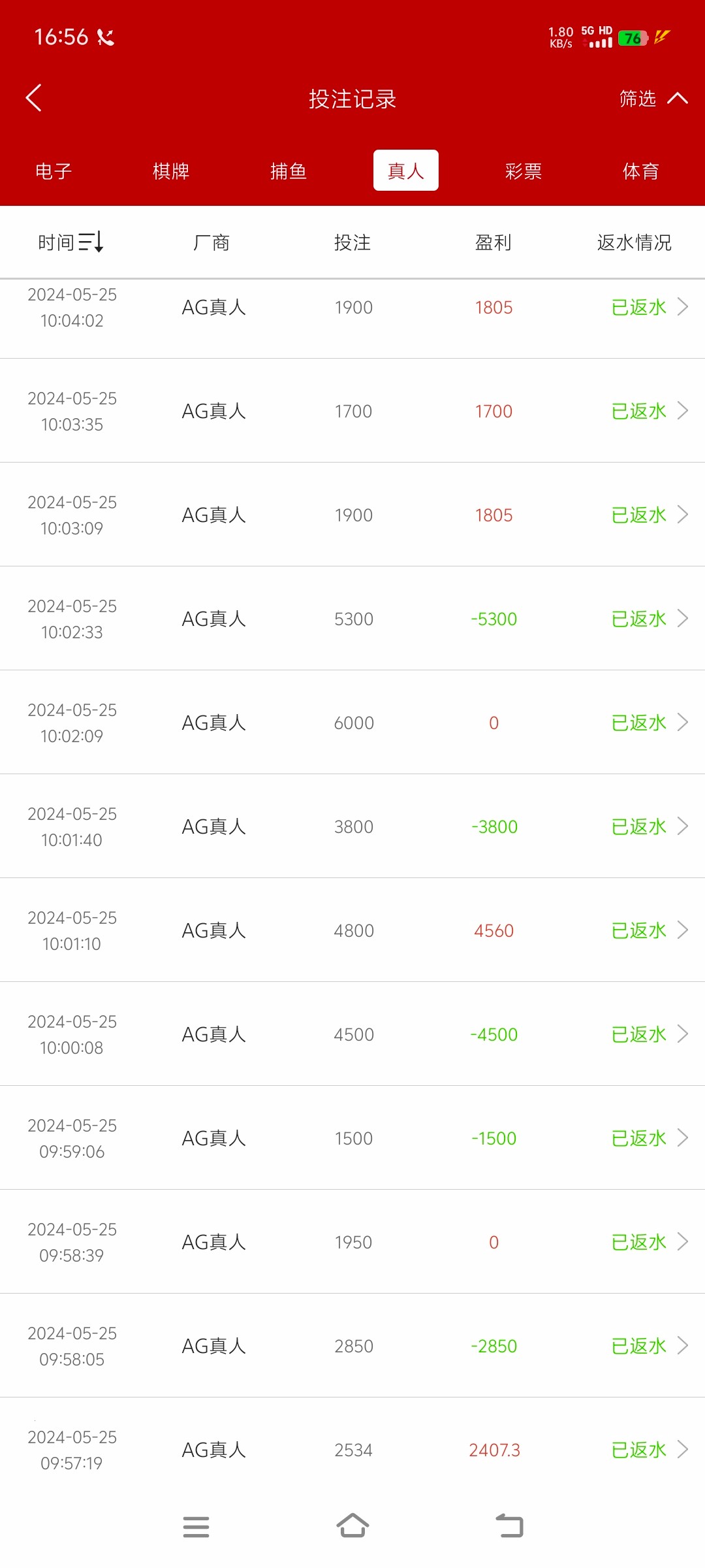 输1.2w 明天充值提现活动能领6k 玩了一个通宵到下午 反反复复充充提提 一个月不到打了136万流水 基本是AG 红了3个多 吐回去1.2个