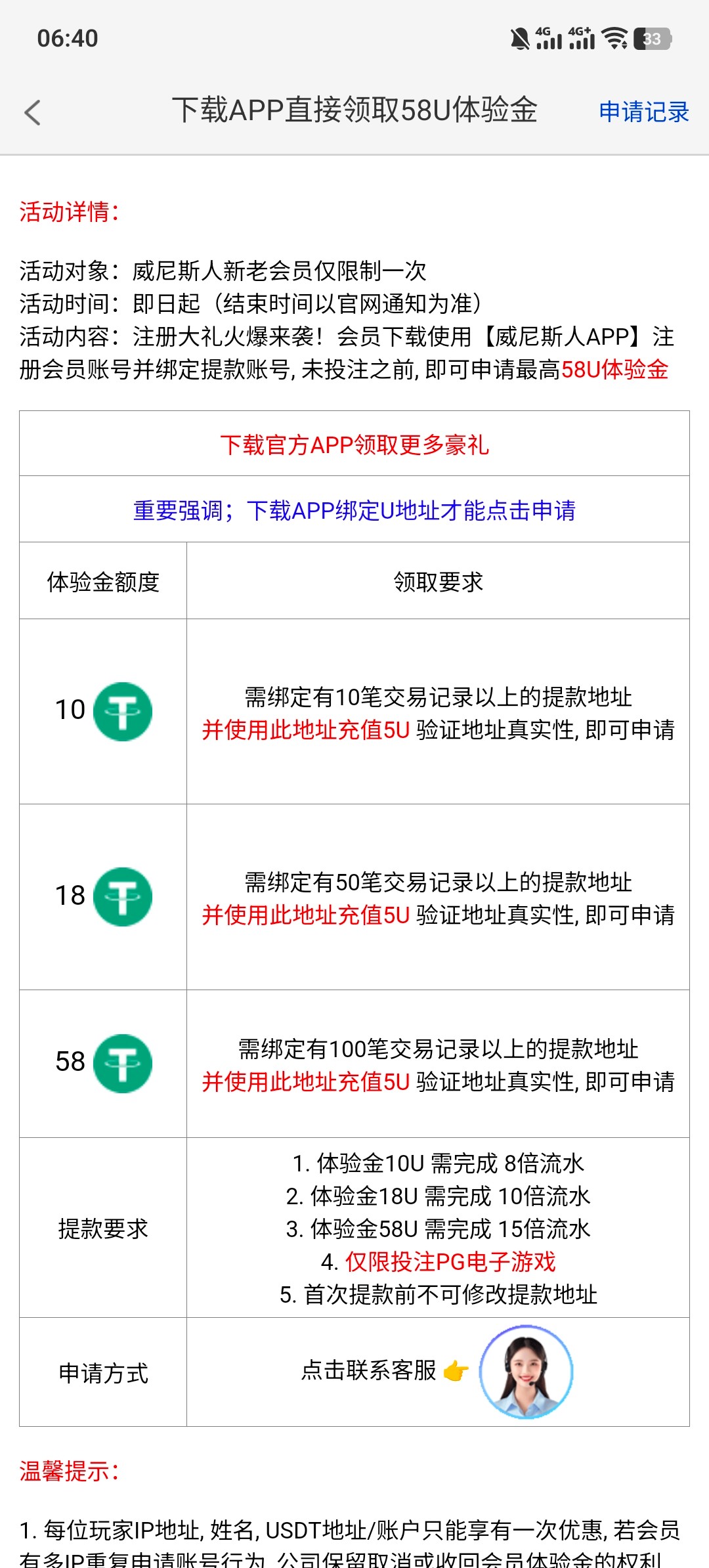 完成信息送8 要充值10才能娱乐 还可以绑定usdt地址申请体金