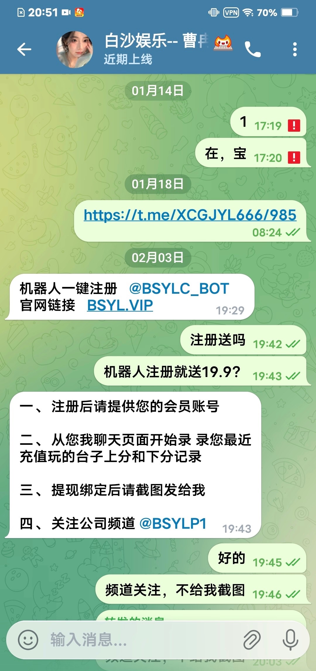 更多充值福利 请点击优惠观看 注意首充赠送30% ,首充未投注前联系客服领取首充奖励 ... 先联系特邀彩金专员飞机号@Bsylcr 给他审核,你注册的账号,地址,绑定的地址必须和提现的地址一致,这个地址必须有提现过,活跃的,我送了,如果不送,这个客服要双向,你可以去他主页找这个网址,先注册,用飞机号,联系在线客服,过几天就会回复你了