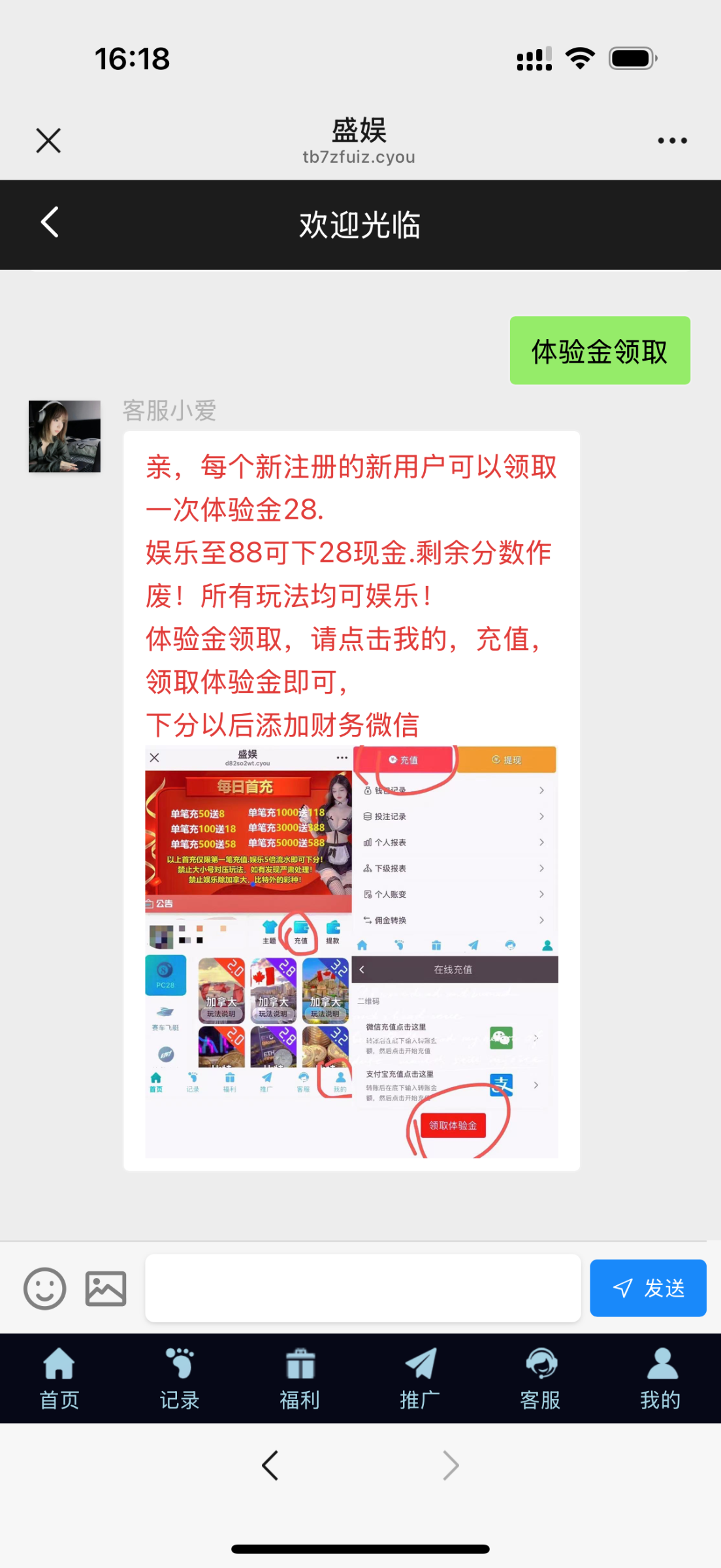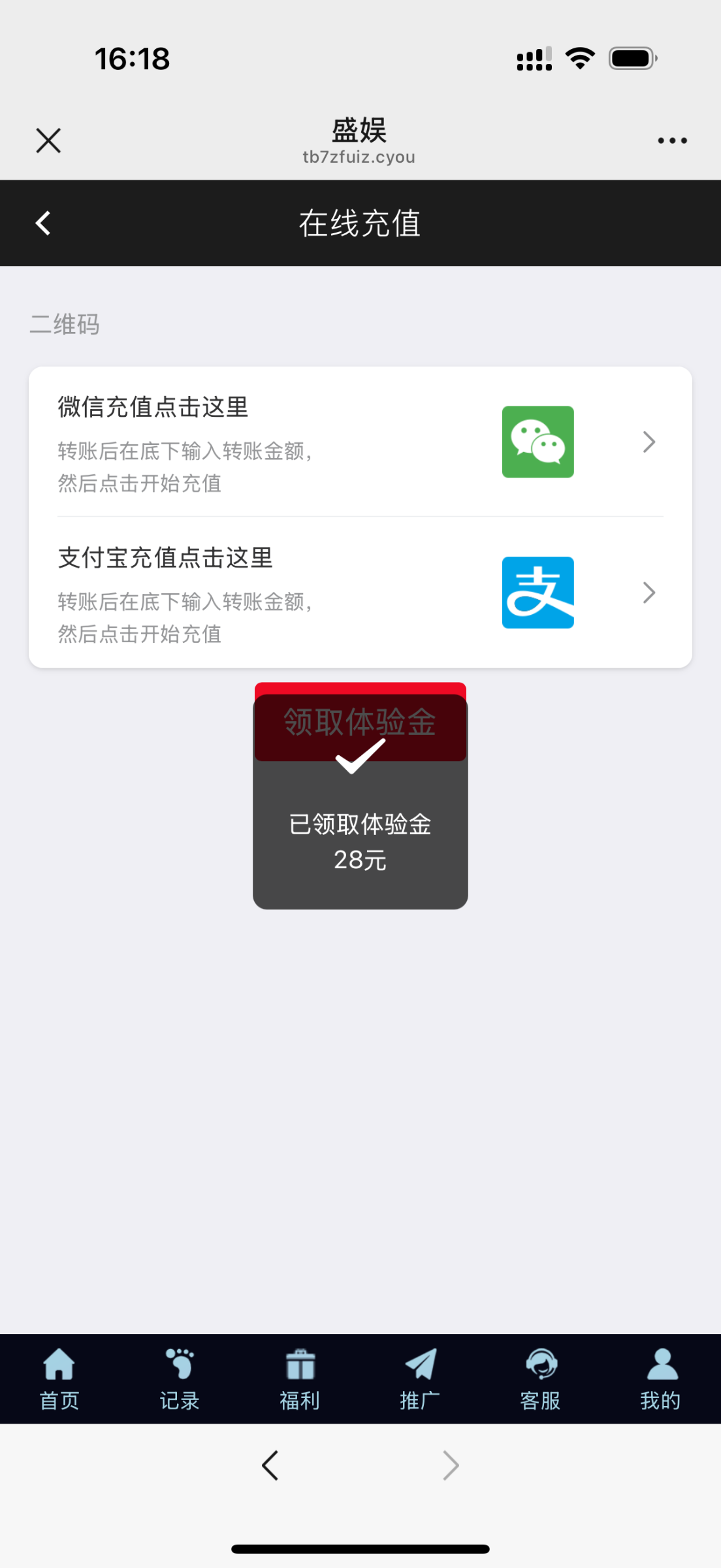 用微信扫码登录点充值领取体验金秒到28打到88下28现金