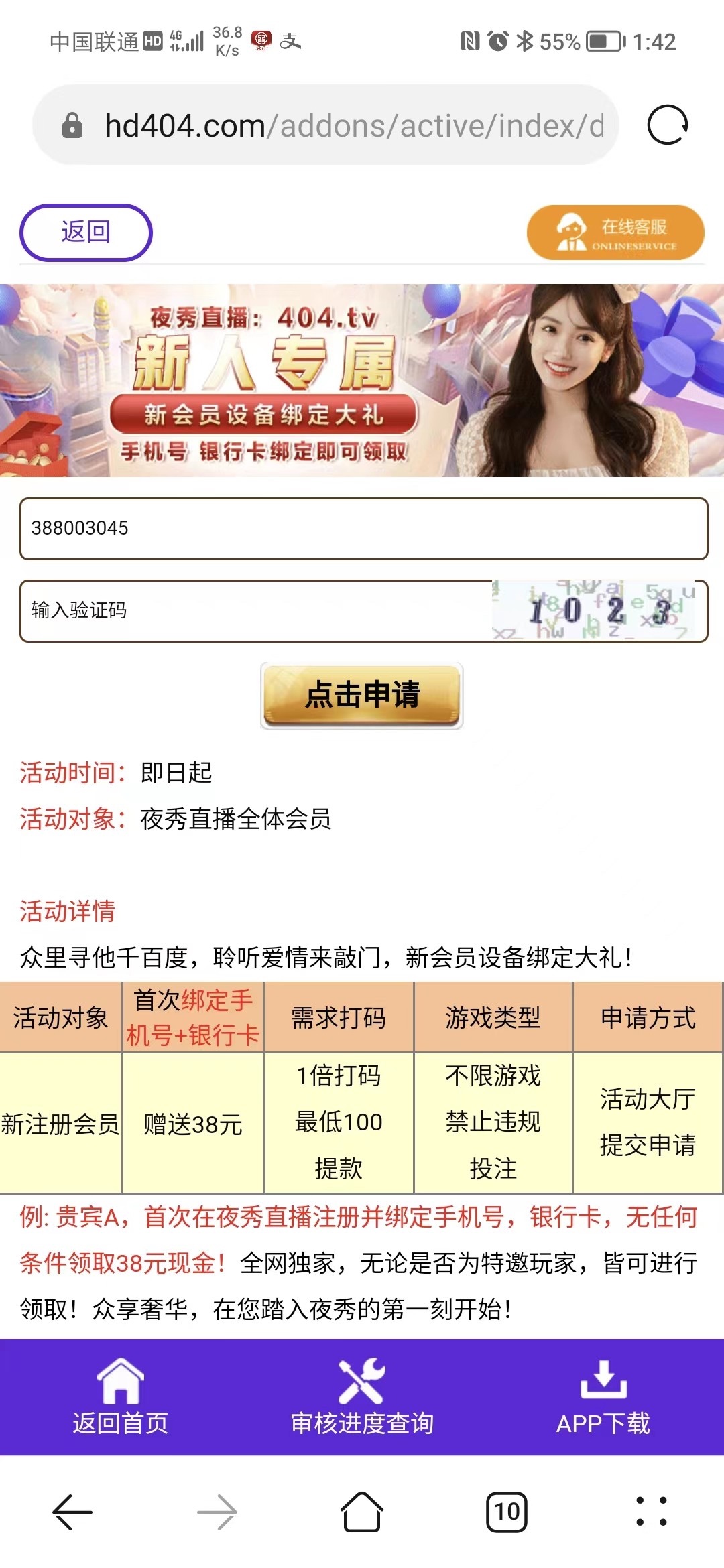 新用户注册绑定手机号绑卡自助申请38彩金最低一百提款