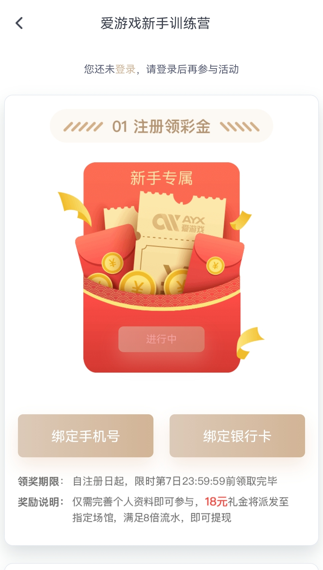 用户下载注册绑卡活动里新人活动自助领取18/3水/100提现